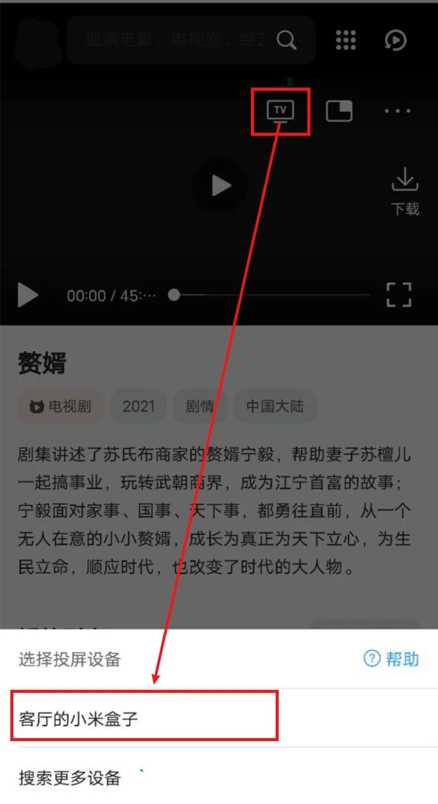 打开QQ浏览器(会接管网页播放器)->打开28短剧->播放视频->选中投屏图标->等待搜寻出智能电视/电视盒子->选中,即可投屏。